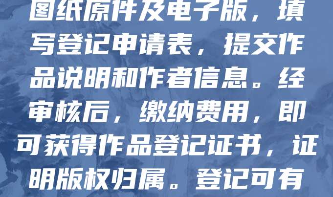 设计图纸版权登记可通过国家版权局或其委托机构进行。首先,准备图纸原件及电子版,填写登记申请表,提交作品说明和作者信息。经审核后,缴纳费用,即可获得作品登记证书,证明版权归属。登记可有效保护设计成果,防止侵权。建议在作品完成即办理,以确保权益。
