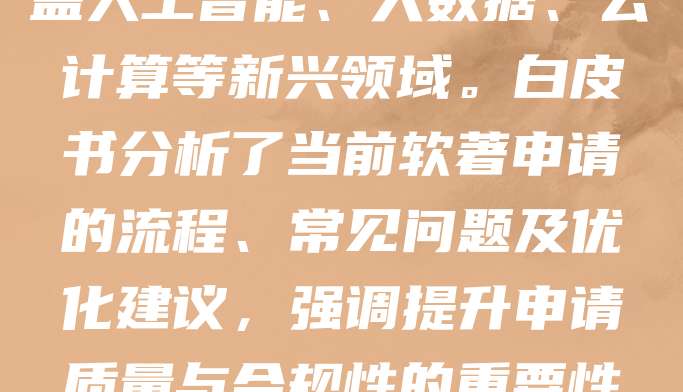 随着数字技术的快速发展,软件著作权(软著)申请日益成为企业保护知识产权的重要手段。软著申请行业白皮书指出,2023年我国软著登记量持续增长,涵盖人工智能、大数据、云计算等新兴领域。白皮书分析了当前软著申请的流程、常见问题及优化建议,强调提升申请质量与合规性的重要性。同时,报告呼吁加强政策引导与行业规范,推动软著制度更加高效、透明。未来,随着科技创新不断深化,软著保护将发挥更大作用,助力企业构建核心竞争力。