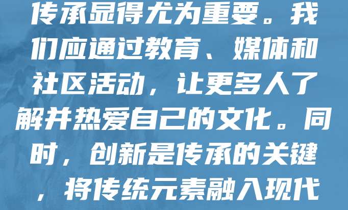 文化传承是民族精神的延续,是历史与未来的桥梁。它不仅包括语言、艺术、习俗等外在形式,更蕴含着价值观与思维方式。在全球化浪潮中,传统文化面临冲击,但正是这种挑战让传承显得尤为重要。我们应通过教育、媒体和社区活动,让更多人了解并热爱自己的文化。同时,创新是传承的关键,将传统元素融入现代生活,才能让文化焕发新生。只有不断传承与创新,才能让文化在时代变迁中保持活力,成为凝聚人心的力量。让我们共同守护文化的根脉,让文明之光代代相传。