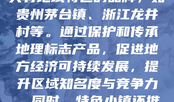 地理标志特色小镇是以地方特色产品为核心,融合文化、旅游与产业发展的新型城镇化模式。这些小镇依托独特的自然环境和历史文化,打造具有地域特色的品牌,如贵州茅台镇、浙江龙井村等。通过保护和传承地理标志产品,促进地方经济可持续发展,提升区域知名度与竞争力。同时,特色小镇还推动了乡村旅游和文化产业的融合发展,助力乡村振兴。未来,应加强品牌建设与科技创新,实现生态保护与经济发展的双赢。