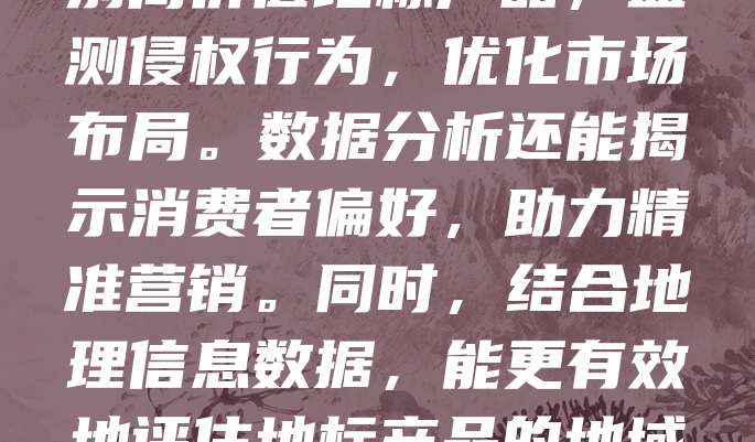 地理标志商标是体现地域特色与文化价值的重要品牌。大数据分析在地理标志商标的保护与推广中发挥着关键作用。通过数据挖掘,可识别高价值地标产品,监测侵权行为,优化市场布局。数据分析还能揭示消费者偏好,助力精准营销。同时,结合地理信息数据,能更有效地评估地标产品的地域影响力和经济价值。随着技术发展,大数据为地理标志商标的管理、保护与传播提供了科学依据,推动地方特色产业可持续发展。