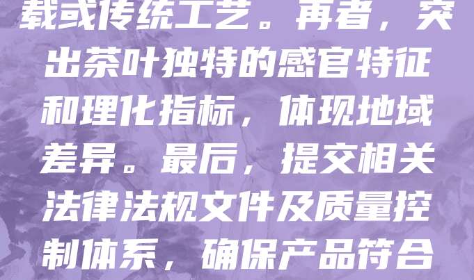 茶叶地理标志申请需注重产地独特性、历史传承与品质特色。首先,明确地理范围,确保产品产自特定区域,具有不可替代的自然环境和人文因素。其次,提供历史渊源证明,如古籍记载或传统工艺。再者,突出茶叶独特的感官特征和理化指标,体现地域差异。最后,提交相关法律法规文件及质量控制体系,确保产品符合国家标准。申请时应由地方政府或行业协会牵头,联合生产者共同申报,以增强权威性和代表性。通过规范流程,有效保护地方特色茶叶品牌,促进产业可持续发展。