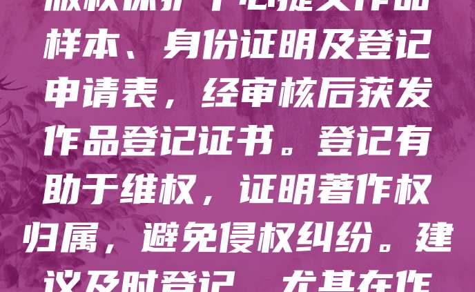 摄影作品完成即享版权,登记可增强法律效力。作者应保留创作过程证据,如拍摄时间、地点、设备信息。向国家版权保护中心提交作品样本、身份证明及登记申请表,经审核后获发作品登记证书。登记有助于维权,证明著作权归属,避免侵权纠纷。建议及时登记,尤其在作品发布或商业使用前。数字时代,版权登记是保护创作者权益的重要手段,提升作品价值与市场竞争力。
