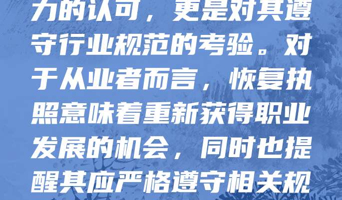 执照恢复是指因违规、过期或被吊销而失去执业资格的人员,通过一定程序重新获得合法执业资格的过程。这一过程通常包括提交申请、参加培训、通过考试或接受审查等步骤。执照恢复不仅是对个人专业能力的认可,更是对其遵守行业规范的考验。对于从业者而言,恢复执照意味着重新获得职业发展的机会,同时也提醒其应严格遵守相关规定,避免再次违规。相关部门在审核过程中需公正透明,确保恢复执照的人员具备相应资质与道德水平。执照恢复制度有助于维护行业秩序,保障公众利益,促进职业环境的健康发展。