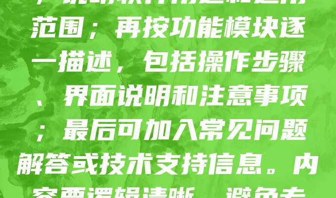 软件功能说明书是描述软件功能、操作流程及使用方法的文档,有助于用户理解和使用软件。撰写时应明确目标用户,分模块介绍功能,语言简洁清晰。先写概述,说明软件用途和适用范围;再按功能模块逐一描述,包括操作步骤、界面说明和注意事项;最后可加入常见问题解答或技术支持信息。内容要逻辑清晰,避免专业术语过多,确保用户易懂。同时,应保持文档更新,与软件版本同步。良好的功能说明书能提升用户体验,减少客服压力,是软件开发的重要组成部分。