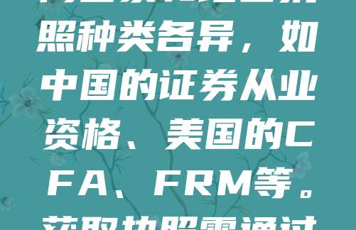 金融执照是从事金融行业的重要资质证明,涵盖证券、基金、银行、保险等多个领域。持有相关执照不仅体现专业能力,也符合监管要求,保障投资者权益。不同国家和地区执照种类各异,如中国的证券从业资格、美国的CFA、FRM等。获取执照需通过专业考试并满足工作经验要求,持续学习是保持执照有效性的关键。随着金融市场不断发展,金融执照在职业发展和行业规范中发挥着越来越重要的作用。