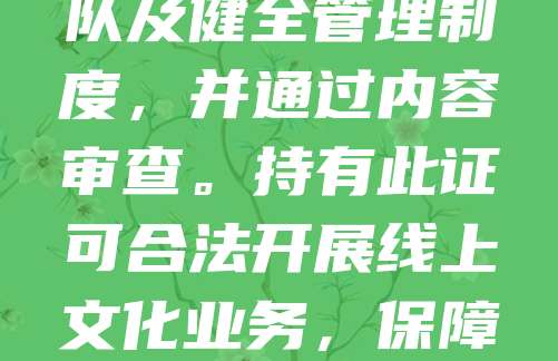 网络文化经营许可证是从事互联网文化活动的法定资质,由文化和旅游部或地方文旅部门颁发。该证适用于提供网络文化产品、服务的企业,如网络游戏、网络表演、网络动漫等。申请需具备法人资格、专业团队及健全管理制度,并通过内容审查。持有此证可合法开展线上文化业务,保障经营活动合规性,维护市场秩序与用户权益。随着数字经济快速发展,该证成为企业进入网络文化领域的“通行证”,对推动行业健康发展具有重要意义。企业应重视资质办理,确保依法依规运营。