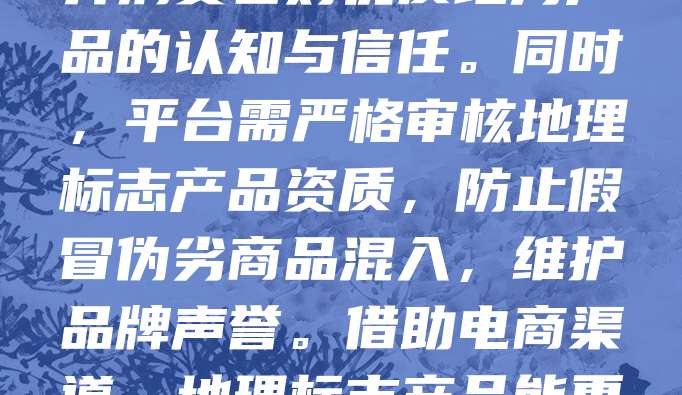 地理标志商标是地域特色产品的“身份证”,具有独特品质和文化价值。电商平台应积极支持地理标志商标的发展,通过设立专区、优化搜索、加强宣传等方式,提升消费者对优质地方产品的认知与信任。同时,平台需严格审核地理标志产品资质,防止假冒伪劣商品混入,维护品牌声誉。借助电商渠道,地理标志产品能更快速触达全国市场,助力乡村振兴与地方经济发展。平台还可联合地方政府、行业协会开展推广活动,打造区域品牌影响力,实现经济效益与社会效益双赢。