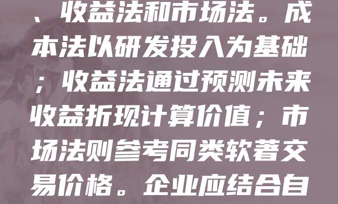 软著作为无形资产,其价值体现在技术含量、市场前景及法律保护等方面。评估时需综合考虑开发成本、使用年限、收益能力及市场竞争状况。常用方法包括成本法、收益法和市场法。成本法以研发投入为基础;收益法通过预测未来收益折现计算价值;市场法则参考同类软著交易价格。企业应结合自身情况选择合适方法,并注重权属清晰与法律保护,以提升软著的估值与市场竞争力。合理评估有助于在融资、并购及知识产权交易中实现资产增值。