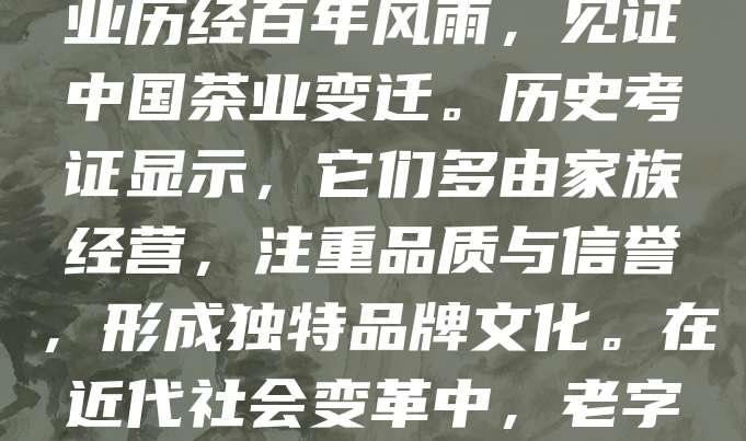 茶叶老字号承载着中国茶文化的历史记忆。如“张一元”创立于1908年,源自北京,以茉莉花茶闻名;“吴裕泰”始创于1875年,传承传统窨制工艺。这些企业历经百年风雨,见证中国茶业变迁。历史考证显示,它们多由家族经营,注重品质与信誉,形成独特品牌文化。在近代社会变革中,老字号曾面临困境,但凭借坚守传统与创新并重,逐渐焕发新生。如今,它们不仅是茶叶品牌,更是中华传统文化的重要载体,具有重要的历史价值与文化意义。