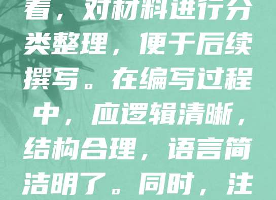 材料准备与编写是完成任何项目或报告的基础。首先,需明确目标,收集相关资料,确保信息准确、全面。接着,对材料进行分类整理,便于后续撰写。在编写过程中,应逻辑清晰,结构合理,语言简洁明了。同时,注意引用规范,避免抄袭。最后,反复校对,确保内容无误。良好的材料准备能提高写作效率,提升成果质量。
