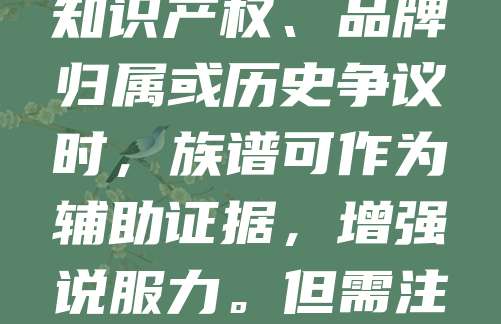 老字号族谱可作为证据,尤其在法律、文化传承和历史研究中具有重要价值。族谱记录了家族世系、迁徙、经营及社会关系,能证明企业或个人的历史渊源与传承脉络。在涉及知识产权、品牌归属或历史争议时,族谱可作为辅助证据,增强说服力。但需注意,其真实性需结合其他史料佐证,如官方档案、契约文书等,以确保法律效力。老字号族谱不仅是家族记忆的载体,更是中华传统文化的重要组成部分,应加以保护与研究。