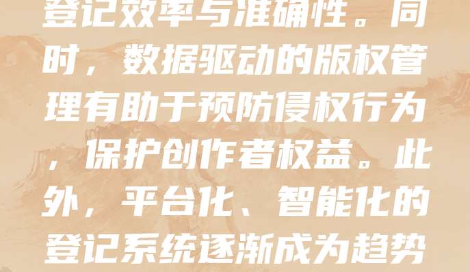 近年来,随着大数据技术的快速发展,数据分析在版权登记中的应用日益广泛。通过大数据分析,可以更精准地识别作品特征,提升版权登记效率与准确性。同时,数据驱动的版权管理有助于预防侵权行为,保护创作者权益。此外,平台化、智能化的登记系统逐渐成为趋势,推动版权服务向高效、透明方向发展。未来,大数据分析将在版权保护中发挥更加重要的作用,助力构建健康有序的知识产权生态。