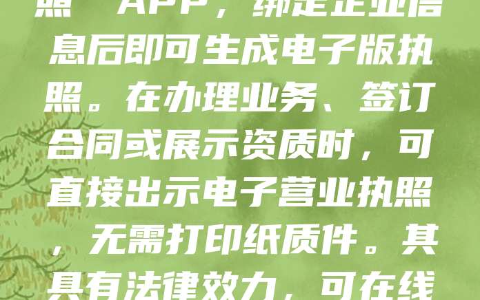 电子营业执照是企业合法经营的“数字身份证”,可通过国家企业信用信息公示系统或“电子营业执照”微信小程序获取。使用时,需先下载并实名认证“电子营业执照”APP,绑定企业信息后即可生成电子版执照。在办理业务、签订合同或展示资质时,可直接出示电子营业执照,无需打印纸质件。其具有法律效力,可在线验证真伪,方便快捷。企业应妥善保管账号密码,避免信息泄露。随着数字化发展,电子营业执照将逐步替代传统纸质证照,提升办事效率,助力企业发展。