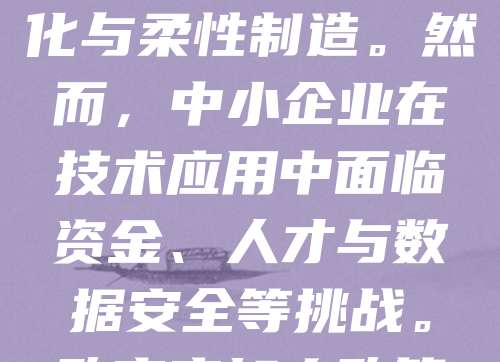 科技型中小企业是推动智能制造发展的生力军。通过引入人工智能、大数据和物联网等技术,企业可提升生产效率、降低成本、增强市场竞争力。智能制造不仅优化了生产流程,还促进了产品个性化与柔性制造。然而,中小企业在技术应用中面临资金、人才与数据安全等挑战。政府应加大政策扶持与公共服务平台建设,助力企业实现数字化转型。未来,随着技术不断进步,科技型中小企业将在智能制造浪潮中发挥更加重要的作用,成为产业升级的重要引擎。