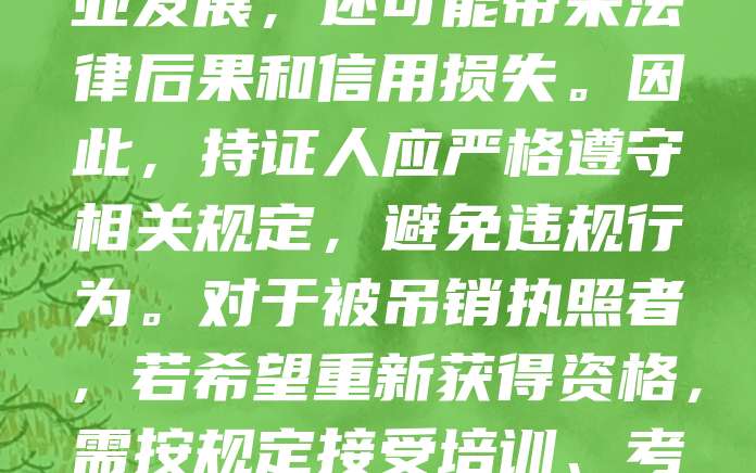 执照吊销是指相关主管部门依法取消个人或单位的执业资格,通常因违反法律法规、职业道德或操作规范而触发。这一措施旨在维护行业秩序与公共利益。吊销执照不仅影响当事人的职业发展,还可能带来法律后果和信用损失。因此,持证人应严格遵守相关规定,避免违规行为。对于被吊销执照者,若希望重新获得资格,需按规定接受培训、考核,并通过审核。执照管理是行业监管的重要手段,有助于提升专业水平与社会信任度。公众也应关注执照状态,选择合法合规的服务提供者,共同营造健康有序的市场环境。