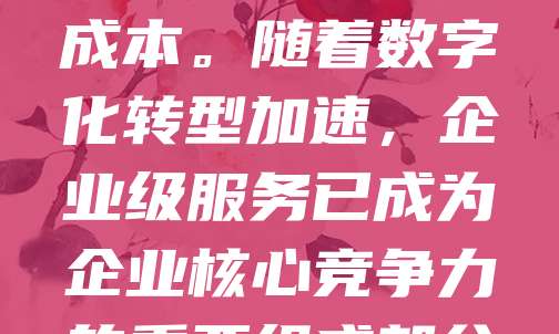 企业级服务是专为大型企业设计的高质量、定制化解决方案,涵盖IT基础设施、云计算、数据管理、安全防护等多个领域。它强调稳定性、可扩展性和安全性,帮助企业提升运营效率、降低管理成本。随着数字化转型加速,企业级服务已成为企业核心竞争力的重要组成部分。通过专业团队和先进技术,企业能够快速响应市场变化,实现业务创新与持续增长。选择可靠的服务提供商,有助于企业在激烈的市场竞争中保持优势,推动可持续发展。