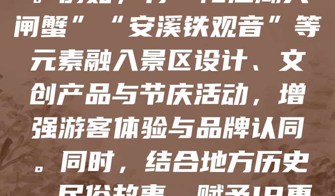 地理标志商标作为地域文化与优质产品的象征,是文旅IP开发的重要资源。通过挖掘地方特色农产品、手工艺品等地理标志,可打造具有文化辨识度的旅游品牌。例如,将“阳澄湖大闸蟹”“安溪铁观音”等元素融入景区设计、文创产品与节庆活动,增强游客体验与品牌认同。同时,结合地方历史、民俗故事,赋予IP更深厚的文化内涵,提升旅游吸引力与经济效益。文旅IP开发应注重保护与创新并重,确保地理标志的独特性与可持续发展,助力乡村振兴与文化传承。