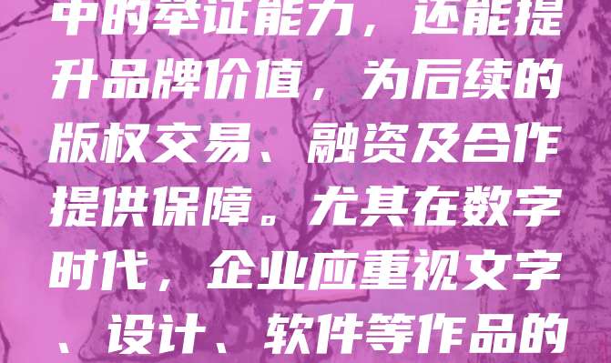 企业版权登记是保护知识产权的重要手段,有助于维护企业的创新成果和市场竞争力。通过依法登记,企业可获得法律上的确权证明,防止他人未经授权使用或抄袭作品。版权登记不仅增强企业在法律纠纷中的举证能力,还能提升品牌价值,为后续的版权交易、融资及合作提供保障。尤其在数字时代,企业应重视文字、设计、软件等作品的版权保护,及时进行登记,确保合法权益不受侵犯。同时,政府也鼓励企业积极申报,享受相关政策支持。因此,企业应充分认识版权登记的重要性,建立健全知识产权管理体系,推动可持续发展。