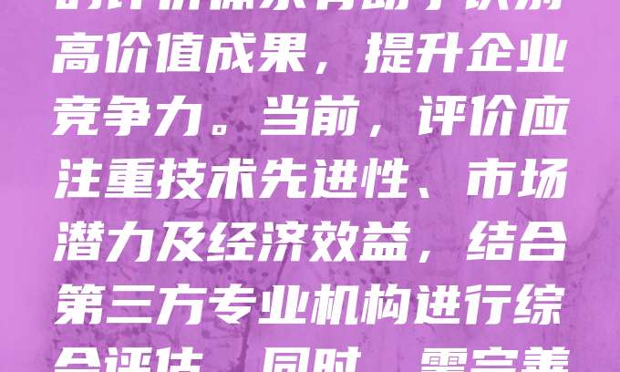 科技型中小企业是推动科技创新的重要力量,其科技成果评价对促进技术转化与产业升级具有重要意义。科学、公正的评价体系有助于识别高价值成果,提升企业竞争力。当前,评价应注重技术先进性、市场潜力及经济效益,结合第三方专业机构进行综合评估。同时,需完善政策支持,优化评价机制,激发企业创新活力,助力科技成果转化落地,为经济高质量发展提供有力支撑。