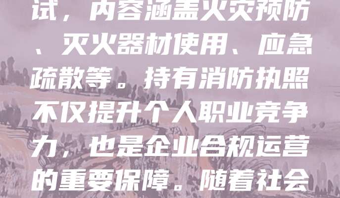 消防执照是从事消防相关工作的必备证件,证明持证人具备相应的消防安全知识和操作能力。它广泛应用于建筑施工、物业管理、企业生产等领域,确保人员和财产安全。申请消防执照需通过专业培训与考试,内容涵盖火灾预防、灭火器材使用、应急疏散等。持有消防执照不仅提升个人职业竞争力,也是企业合规运营的重要保障。随着社会对消防安全重视程度不断提高,消防执照的必要性日益凸显。相关部门也在加强监管,确保从业人员素质,减少火灾隐患。总之,消防执照是保障公共安全的重要工具,值得每一位相关人员重视和考取。