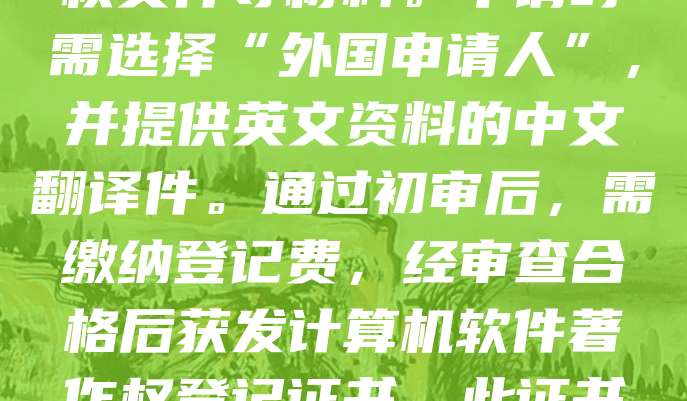 海外公司可委托中国境内代理人或律师事务所,向中国国家版权局提交软件著作权登记申请。需准备软件说明书、代码片段、身份证明及授权文件等材料。申请时需选择“外国申请人”,并提供英文资料的中文翻译件。通过初审后,需缴纳登记费,经审查合格后获发计算机软件著作权登记证书。此证书有助于保护海外公司在华的软件知识产权,提升市场竞争力。建议提前咨询专业机构,确保材料合规,提高审核通过率。