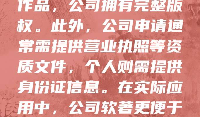 个人与公司申请软件著作权的主要区别在于申请主体、权利归属及使用范围。个人申请软著,著作权归属于个人,适合开发者独立开发的软件;而公司申请则归属企业,适用于员工职务作品,公司拥有完整版权。此外,公司申请通常需提供营业执照等资质文件,个人则需提供身份证信息。在实际应用中,公司软著更便于商业推广和知识产权保护,而个人软著更适合个人成果展示与技术积累。两者均受法律保护,但权利行使和管理方式有所不同,申请人应根据自身需求选择合适的申请主体。