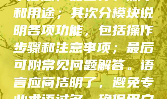 软件功能说明书是描述软件功能、操作流程和使用方法的文档,有助于用户理解和使用软件。撰写时应明确目标用户,结构清晰,内容详实。首先介绍软件的基本信息,如名称、版本和用途;其次分模块说明各项功能,包括操作步骤和注意事项;最后可附常见问题解答。语言应简洁明了,避免专业术语过多,确保用户易懂。同时,注意格式规范,使用图表或截图增强可读性。良好的功能说明书能提升用户体验,减少技术支持压力,是软件开发的重要组成部分。