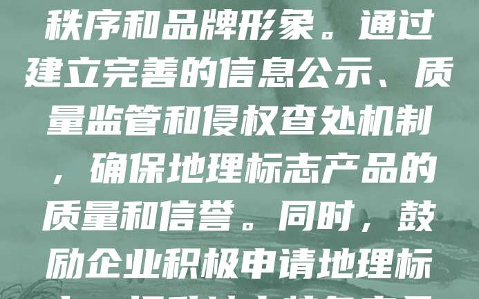 地理标志商标是用于标识某地区特定产品来源及其独特品质的标志,具有地域性和独特性。市场监管部门应加强对地理标志商标的保护与管理,防止假冒伪劣产品误导消费者,维护市场秩序和品牌形象。通过建立完善的信息公示、质量监管和侵权查处机制,确保地理标志产品的质量和信誉。同时,鼓励企业积极申请地理标志,提升地方特色产品的市场竞争力,促进区域经济发展。加强地理标志商标的监管,不仅有助于保护消费者权益,也有助于推动乡村振兴和特色产业可持续发展。