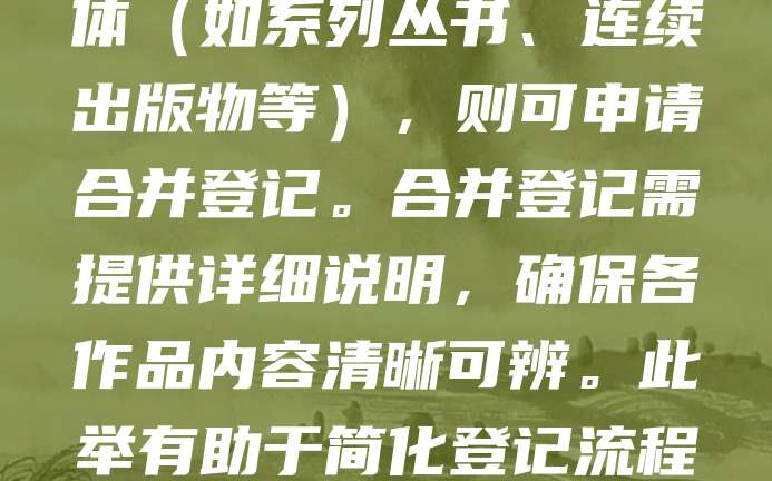 不同作品是否可以合并登记,主要取决于著作权登记的相关规定。根据计算机软件保护条例和作品自愿登记试行办法,同一作者的多个作品,若具有独立性和完整性,通常可分别登记。但若作品属于同一整体(如系列丛书、连续出版物等),则可申请合并登记。合并登记需提供详细说明,确保各作品内容清晰可辨。此举有助于简化登记流程,提高管理效率。但应注意,合并登记可能影响单独维权与转让。因此,在决定是否合并登记前,应充分了解政策要求,并结合实际需求作出选择。合理利用登记制度,有助于更好地保护创作者权益。