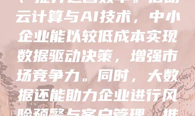 科技型中小企业在大数据分析的应用中展现出巨大潜力。通过数据分析,企业可精准把握市场需求、优化产品设计、提升运营效率。借助云计算与AI技术,中小企业能以较低成本实现数据驱动决策,增强市场竞争力。同时,大数据还能助力企业进行风险预警与客户管理,推动创新与发展。未来,随着技术不断进步,科技型中小企业将更深入地融入数据化转型,实现高质量发展。