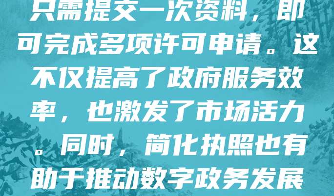 执照简化是提升行政效率、优化营商环境的重要举措。近年来,多地推行“一证通办”“多证合一”等改革,减少重复审批,降低企业办事成本。通过整合审批流程、精简材料,企业只需提交一次资料,即可完成多项许可申请。这不仅提高了政府服务效率,也激发了市场活力。同时,简化执照也有助于推动数字政务发展,实现“数据多跑路,群众少跑腿”。未来,应进一步推进跨部门信息共享,扩大简化范围,让民众和企业享受更便捷的服务。执照简化不仅是制度创新,更是治理能力现代化的体现。