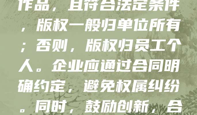 员工创作的作品,其版权归属需根据具体情况判断。若作品属于职务作品,且符合法定条件,版权一般归单位所有;否则,版权归员工个人。企业应通过合同明确约定,避免权属纠纷。同时,鼓励创新,合理分配权益,有助于激发员工创造力,促进企业发展。