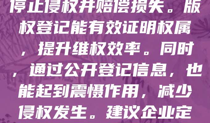 版权登记是打击假冒侵权的重要法律手段。企业应首先对自身作品进行版权登记,取得法律证据。一旦发现侵权行为,可向市场监管部门举报或提起诉讼,要求停止侵权并赔偿损失。版权登记能有效证明权属,提升维权效率。同时,通过公开登记信息,也能起到震慑作用,减少侵权发生。建议企业定期核查市场,及时发现侵权线索,维护自身合法权益。合理利用版权登记制度,不仅能保护知识产权,还能增强品牌竞争力,推动市场健康发展。