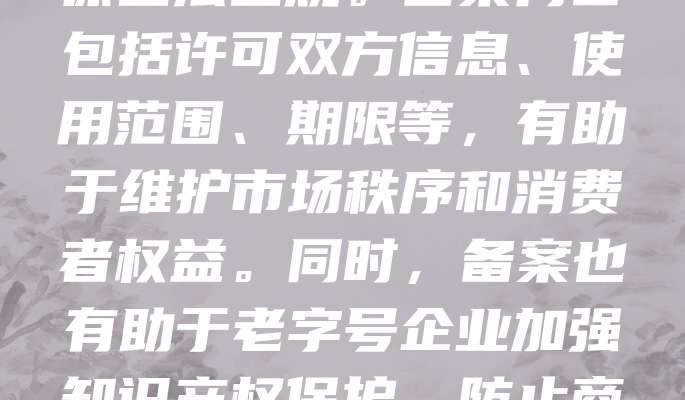 老字号商标许可备案是保护传统品牌的重要举措。随着商业发展,老字号企业常通过许可方式授权他人使用其商标,提升品牌影响力。为规范管理,国家要求相关许可需进行备案,确保合法合规。备案内容包括许可双方信息、使用范围、期限等,有助于维护市场秩序和消费者权益。同时,备案也有助于老字号企业加强知识产权保护,防止商标被滥用或侵权。近年来,随着政策支持,老字号商标许可备案制度不断完善,助力传统品牌焕发新生机。企业应重视备案流程,确保合法使用,推动品牌可持续发展。