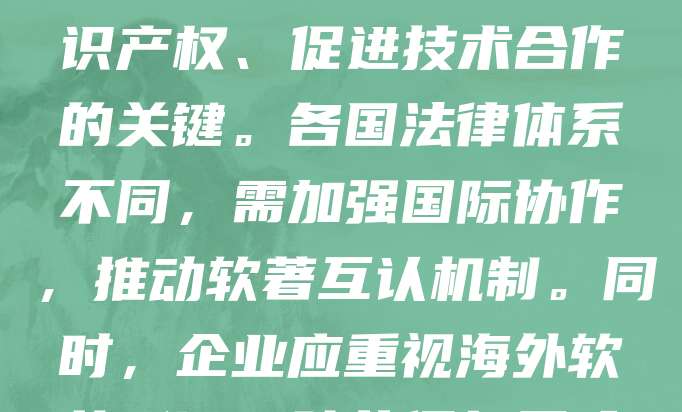 软著(软件著作权)在“一带一路”国家的保护日益重要。随着数字技术合作加深,中国与沿线国家在软件开发、信息共享等领域交流频繁,软著保护成为维护知识产权、促进技术合作的关键。各国法律体系不同,需加强国际协作,推动软著互认机制。同时,企业应重视海外软著登记,防范侵权风险。通过政策引导与法律保障,提升软著保护水平,有助于构建公平、安全的数字贸易环境,助力“一带一路”高质量发展。