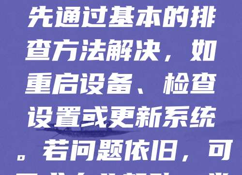 在日常生活中,人们常常会遇到各种常见问题。例如,电脑运行缓慢、手机电量不足、网络连接不稳定等。这些问题虽然看似简单,但若不及时处理,可能会影响工作效率和生活质量。面对这些问题,我们可以先通过基本的排查方法解决,如重启设备、检查设置或更新系统。若问题依旧,可寻求专业帮助。掌握一些基础的解决技巧,不仅能提高解决问题的效率,还能增强我们的自信心。因此,了解并学习常见的问题解决方法是非常有必要的。只有不断积累经验,才能更好地应对生活中的各种挑战。