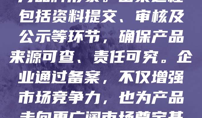 地标产品企业使用备案是指企业将具有地方特色、品质优良的产品向相关部门进行登记备案,以确保其符合地方标准和质量要求。此举有助于规范市场秩序,保护消费者权益,提升地方品牌形象。备案过程包括资料提交、审核及公示等环节,确保产品来源可查、责任可究。企业通过备案,不仅增强市场竞争力,也为产品走向更广阔市场奠定基础。同时,备案制度也促使企业加强质量管理,推动地方特色产业可持续发展。因此,地标产品企业积极进行备案,是提升品牌影响力和保障产品质量的重要举措。