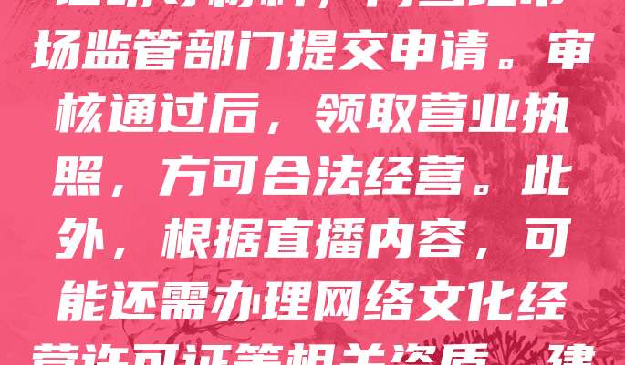 直播行业蓬勃发展,办理营业执照成为从业者必经步骤。首先,需确定经营类型,如个体工商户或公司。随后,准备身份证明、经营场所证明等材料,向当地市场监管部门提交申请。审核通过后,领取营业执照,方可合法经营。此外,根据直播内容,可能还需办理网络文化经营许可证等相关资质。建议提前咨询相关部门,确保流程顺畅。营业执照不仅是合法经营的凭证,也便于后期拓展业务、申请平台入驻。规范经营,才能长久发展。