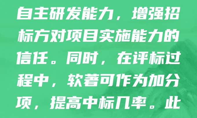 软著(软件著作权)在招投标中具有重要作用。它是企业技术实力和知识产权的重要体现,有助于提升投标竞争力。拥有软著可证明企业具备自主研发能力,增强招标方对项目实施能力的信任。同时,在评标过程中,软著可作为加分项,提高中标几率。此外,软著还能避免侵权风险,保障项目合法合规进行。因此,在招投标活动中,企业应重视软著的申请与保护,以提升整体竞争力。