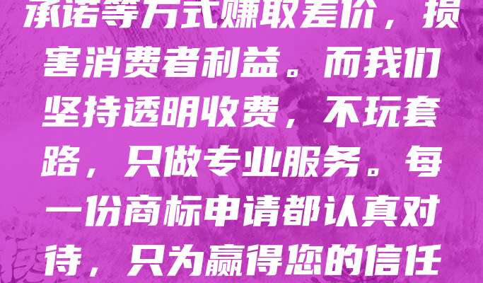 商标申请268元,看似价格实惠,但背后却隐藏着不少陷阱。一些机构以低价吸引客户,实则通过加价服务、虚假承诺等方式赚取差价,损害消费者利益。而我们坚持透明收费,不玩套路,只做专业服务。每一份商标申请都认真对待,只为赢得您的信任与口碑。选择我们,不仅是选择一个价格,更是选择一份安心与保障。让我们用实力说话,用口碑赢得市场!