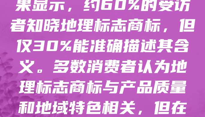 地理标志商标是体现产品原产地和独特品质的重要标识。为了解消费者对地理标志商标的认知情况,本次调查采用问卷形式,覆盖不同年龄、职业的消费者。结果显示,约60%的受访者知晓地理标志商标,但仅30%能准确描述其含义。多数消费者认为地理标志商标与产品质量和地域特色相关,但在购买时仍以价格和品牌为主导因素。调查显示,消费者对地理标志商标的认知度有待提升,建议加强宣传与教育,增强消费者对优质产品的识别能力与信任感。