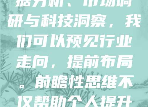 在快速变化的时代,趋势与前瞻成为决定成败的关键。趋势是事物发展的方向,而前瞻则是对未来的预判与准备。只有敏锐捕捉趋势,才能把握机遇、规避风险。未来属于那些善于观察、思考和行动的人。通过数据分析、市场调研与科技洞察,我们可以预见行业走向,提前布局。前瞻性思维不仅帮助个人提升竞争力,也推动企业和社会持续进步。在不确定性日益增加的今天,培养趋势意识与前瞻能力尤为重要。唯有不断学习、适应变化,才能在变革中立于不败之地。趋势引领未来,前瞻成就卓越。