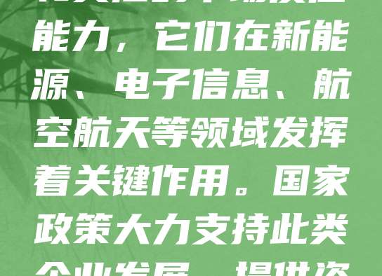 新材料科技型中小企业是推动产业升级的重要力量。这类企业聚焦于高性能、环保型新材料的研发与应用,如纳米材料、复合材料和新型储能材料等。凭借技术创新和灵活的市场反应能力,它们在新能源、电子信息、航空航天等领域发挥着关键作用。国家政策大力支持此类企业发展,提供资金、税收优惠及平台资源。未来,随着全球对可持续发展的重视,新材料科技型中小企业将迎来更广阔的发展空间,成为引领产业变革的重要引擎。