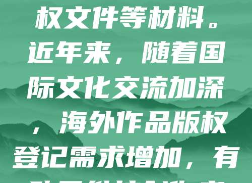 海外作品在中国登记版权需通过国家版权局或其指定机构进行。根据著作权法,外国人、无国籍人的作品首先在中国境内出版的,享有中国著作权保护。登记时需提供作品原件、作者身份证明及授权文件等材料。近年来,随着国际文化交流加深,海外作品版权登记需求增加,有助于维护创作者权益,促进文化产业发展。同时,中国加强与国际版权组织合作,推动版权保护国际化。合理登记版权,既能保障原创者利益,也有利于构建健康有序的版权生态。