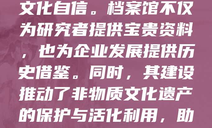老字号档案馆是保护和传承中华优秀传统文化的重要载体。通过系统收集、整理和保存老字号企业的历史资料、商标、工艺流程等,有助于延续品牌文化,增强文化自信。档案馆不仅为研究者提供宝贵资料,也为企业发展提供历史借鉴。同时,其建设推动了非物质文化遗产的保护与活化利用,助力传统产业升级。在数字化时代,老字号档案馆应加强信息化建设,提升档案管理效率与公众服务功能,让老品牌焕发新活力,更好地服务于社会与经济的发展。