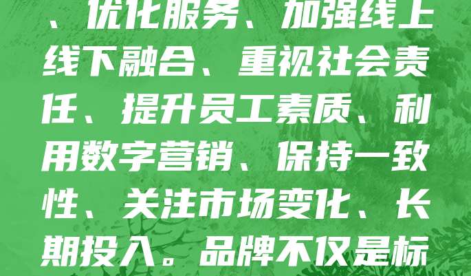 品牌建设是企业发展的核心动力。15个关键要素包括:明确品牌定位、塑造独特形象、强化用户体验、打造优质产品、建立情感连接、注重口碑传播、持续创新、优化服务、加强线上线下融合、重视社会责任、提升员工素质、利用数字营销、保持一致性、关注市场变化、长期投入。品牌不仅是标识,更是信任与价值的象征。通过系统化建设,企业能增强竞争力,赢得消费者忠诚。在激烈竞争中,唯有不断打磨品牌,才能立于不败之地。