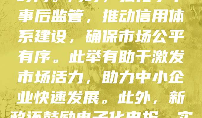近日,国家出台新的执照管理新政,旨在优化营商环境,提升行政审批效率。新政明确简化审批流程,推行“一窗受理、限时办结”,大幅缩短企业获取执照的时间。同时,强化事中事后监管,推动信用体系建设,确保市场公平有序。此举有助于激发市场活力,助力中小企业快速发展。此外,新政还鼓励电子化申报,实现“网上办、掌上办”,方便群众办事。这一系列改革措施,标志着我国在深化“放管服”改革方面迈出坚实步伐,为经济高质量发展注入新动能。
