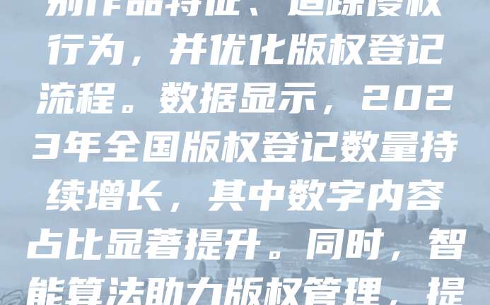 近年来,随着大数据技术的快速发展,数据分析在版权登记中的应用日益广泛。通过大数据分析,可以更高效地识别作品特征、追踪侵权行为,并优化版权登记流程。数据显示,2023年全国版权登记数量持续增长,其中数字内容占比显著提升。同时,智能算法助力版权管理,提高确权效率。未来,大数据将推动版权登记向智能化、精准化方向发展,为知识产权保护提供更强支撑。
