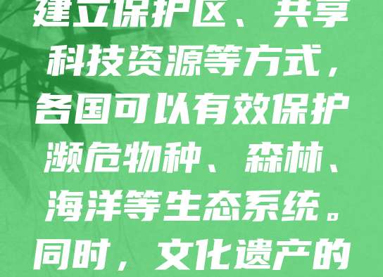 国际保护是指各国共同合作,保护全球重要的自然和文化遗产,维护生态平衡与人类共同利益。随着环境问题日益严峻,气候变化、生物多样性减少等挑战需要国际社会携手应对。通过签署国际公约、建立保护区、共享科技资源等方式,各国可以有效保护濒危物种、森林、海洋等生态系统。同时,文化遗产的国际保护也至关重要,有助于传承人类文明成果。国际保护不仅关乎环境保护,更是促进全球可持续发展的重要途径。只有加强国际合作,才能实现人与自然的和谐共生,为子孙后代留下宜居的地球。